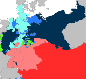ما بعد الحرب الپروسية النمساوية. پروسيا (أزرق داكن) وحلفائها (أزرق) ضد النمسا (أحمر) وحلفائها (وردي). أعضاء حياديون في كونفدرالية ألمانيا بالأخضر، الأراضي التي استولت عليها پروسيا بالأزرق الفاتح.