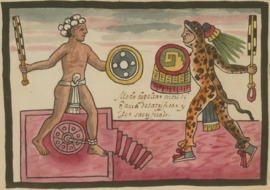 This page from the Codex Tovar depicts a scene of gladiatorial sacrificial rite, celebrated on the festival of Tlacaxipehualiztli.