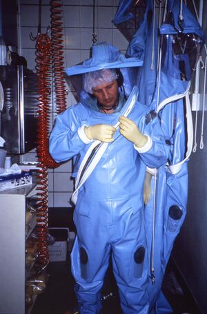 فني في مراكز السيطرة على الأمراض يرتدي بدلة الضغط الإيجابي من الطراز الأقدم قبل الدخول إلى أحد مختبرات BSL-4 التابعة لمراكز السيطرة على الأمراض والوقاية منها.