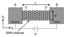 A graphene nanoribbon field-effect transistor (GNR-FET). Here contacts A and B are at two different Fermi levels and .