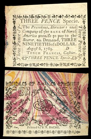The bank issued its own notes that superseded the troubled Continental currency bills. These notes were printed on paper with colored fibers pressed into the reverse side as an anti-counterfeiting measure. Unlike the Continental bills, the new notes carried a promise to pay silver on demand. Despite these changes, the bank had difficulty at first persuading people of its good credit, and at one point it employed repossessors to follow people who redeemed notes and urge them to deposit the money back. To promote the impression that it had a large reserve, the bank made a show of moving cash boxes to and from its cellar. Once the stock was fully subscribed and paid, doubts subsided and the notes rose to par value.[2] By 1783, several states including Massachusetts enacted legislation allowing Americans to pay taxes with Bank of North America notes,[17] giving them a crucial aspect of legal tender.