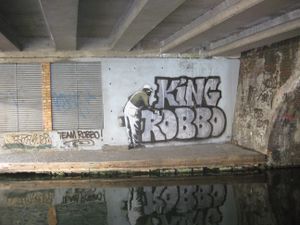 The location of the damaged 1985 graffiti by Robbo in Camden, London allegedly painted over by Banksy and subsequently painted over by Robbo in retaliation.