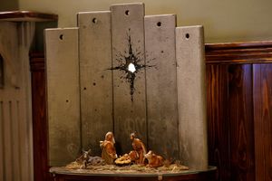 لوحة "بطاقة عيد الميلاد" لبانكسي 2005، تظهر اللوحة جدار الفصل العنصري الإسرائيلي وهو يمنع مريم العذراء والقديس يوسف النجار من الوصول لبيت لحم