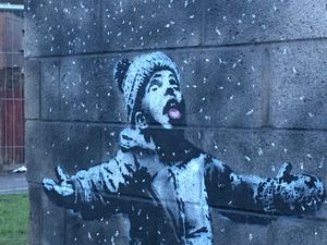 Season's Greetings was created by Banksy in Port Talbot, Wales, in December 2018, and was quickly provided with a temporary protective covering to prevent vandalism.