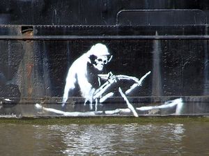 Stencil on the waterline of Thekla, an entertainment boat in central Bristol – (wider view). The section of the hull with this picture has now been removed and is on display at the M Shed museum. The image of Death is based on a nineteenth-century etching illustrating the pestilence of The Great Stink.[9]