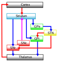 - ^ أ ب Silkis I (January 2001). "The cortico-basal ganglia-thalamocortical circuit with synaptic plasticity. II. Mechanism of synergistic modulation of thalamic activity via the direct and indirect pathways through the basal ganglia". Bio Systems. 59 (1): 7–14. doi:10.1016/s0303-2647(00)00135-0. PMID 11226622.