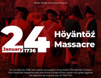 In the spring of 1736, Kirillov burned 200 Bashkir villages, killed 700 rebels in battle and executed 158. An expedition of 773 men left Orenburg in November and lost 500 from cold and hunger. During the time, the Bashkir rebels planned to massacre the sleeping Russians at Seiantusa. The ambush failed. In retaliation, one thousand villagers, including women and children, were put to the sword and another 500 driven into a storehouse and burned to death. Raiding parties then went out and burned about 50 villages and killed another 2,000. Eight thousand Bashkirs attacked a Russian camp and killed 158, losing 40 killed and three prisoners who were promptly hanged. Bashkir rebels also attacked Bashkirs loyal to Russia. The number of Bashkirs loyal to Russia was small and amounted to approximately 150.[5] Leaders who submitted were sometimes fined one horse per household and sometimes hanged.