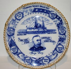 ![]() Contemporary colored print, showing يوإسإس Olympia in the left foreground, leading the U.S. Asiatic Squadron against the Spanish fleet off Cavite. A vignette portrait of Rear Admiral George Dewey is featured in the lower left. | |||||||