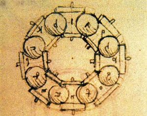 Leonardo da Vinci incorporated drawings of ball bearings in his design for a helicopter around the year 1500; this is the first recorded use of bearings in an aerospace design. However, Agostino Ramelli is the first to have published roller and thrust bearings sketches.[9] An issue with the ball and roller bearings is that the balls or rollers rub against each other, causing additional friction. This can be reduced by enclosing each individual ball or roller within a cage. The captured, or caged, ball bearing was originally described by Galileo in the 17th century.[10]