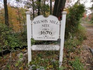 The ruins of this old mill over Vine Brook (on Wilson and Old Burlington Road) were added to the national historical register in 2003 (see photo). A 1972 "Bedford Landmark Tour" says, "Site of the Wilson mills dating from about 1685; mills, dam, and pond passed from the Wilson family about 1770 to Oliver Bacon, then bought by Jonas Gleason (1782) and by Simeon Blodgett (1816); through the years, the site was operated as a grist mill, a saw mill, and later a cider mill."[12]