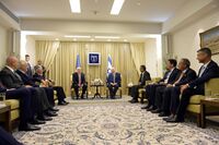 صورة الحكومة الإسرائيلية الرابعة والثلاثون في عام 2015، في قاعة الاحتفال في منزل الرئيس، على خلفية جدار الشهرة لإغاثة القدس بقلم موشيه كاستل