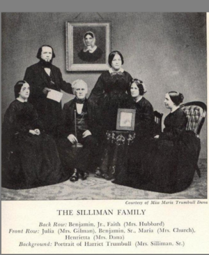 His first marriage was on September 17, 1809, to Harriet Trumbull,[أ] daughter of Connecticut Governor Jonathan Trumbull Jr. Silliman and his wife had four children: one daughter married Professor Oliver P. Hubbard, another married Professor James Dwight Dana (Silliman's doctoral student until 1833 and assistant from 1836 to 1837);[3] and youngest daughter Julia married Edward Whiting Gilman, brother of Yale graduate and educator Daniel Coit Gilman. His son Benjamin Silliman Jr., also a professor of chemistry at Yale, wrote a report that convinced investors to back George Bissell's seminal search for oil. His second marriage was in 1851 to Mrs. Sarah Isabella (McClellan) Webb, daughter of John McClellan. Silliman died at New Haven and is buried in Grove Street Cemetery.