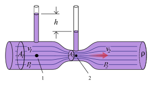 تيار هوائي يمر على ڤنتوري ميتر. الطاقة الحركية تزداد على حساب ضغط المائع، كما يظهر في فرق الارتفاع لعمودي الماء.