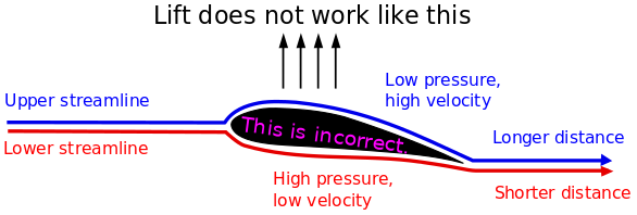 One of the most common erroneous explanations of aerodynamic lift asserts that the air must traverse the upper and lower surfaces of a wing in the same amount of time, implying that since the upper surface presents a longer path the air must be moving over the top of the wing faster than over the bottom. Bernoulli's principle is then cited to conclude that the pressure on top of the wing must be lower than on the bottom.[24][25]
