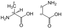 شكل 1: مقارنة بيتا ألانين (يمين) مع الحمض الأميني (chiral) الاعتيادي L-α-آلانين (يسار)