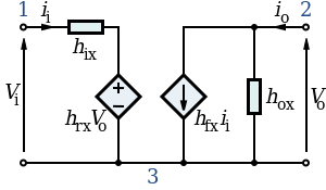 As shown, the h-parameters have lower-case subscripts and hence signify AC conditions or analyses. For DC conditions they are specified in upper-case. For the CE topology, an approximate h-parameter model is commonly used which further simplifies the circuit analysis. For this the hoe and hre parameters are neglected (that is, they are set to infinity and zero, respectively). The h-parameter model as shown is suited to low-frequency, small-signal analysis. For high-frequency analyses the inter-electrode capacitances that are important at high frequencies must be added.