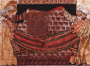 صورة رسم اقتراضي أثناء قيام النبي محمد برفع الحجر الأسود محمولاً على ثوب لقبائل قريش: من كتاب جامع التواريخ للهمذاني.