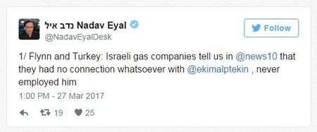 وفي 27 مارس، قام ندڤ إيال، مراسل الشئون الدولية في القناة العاشرة الإسرائيلية، بإماطة اللثام عن حقيقة أن مايكل فلن قال في إشهار الوكالة أنه تقاضى عشرات الآلاف من الدولارات من رجل الأعمال التركي الشاب "إكيم ألپتكين"، رئيس مجلس الأعمال الأمريكي-التركي لعمل فيديو دعاية لصالح شركة إسرائيلية لتصدير الغاز إلى تركيا عبر خط أنابيب. ندف إيال خمن أن تلك الشركة هي إما دِلِك أو راتيو (المملوكة للجيش الإسرائيلي) لأنهما المنتجتان للغاز. فاتصل بهما إلا أنهما نفتا أي صلة برجل الأعمال التركي. فات على ندڤ إيال أن الشركة الإسرائيلية المذكورة هي غالباً إسرائيلية تركية وهي شركة زورلو للطاقة.[1]