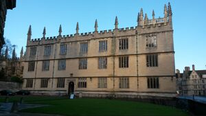 Whilst the Bodleian Library, in its current incarnation, has a continuous history dating back to 1602, its roots date back even further. The first purpose-built library known to have existed in Oxford was founded in the 14th century under the will of Thomas Cobham, Bishop of Worcester (d. 1327). This small collection of chained books was situated above the north side of the University Church of St Mary the Virgin on the High Street.[9][10] This collection continued to grow steadily, but when Humphrey, Duke of Gloucester (brother of Henry V of England) donated a great collection of manuscripts between 1435 and 1437, the space was deemed insufficient and a larger building was required. A suitable room was finally built above the Divinity School, and completed in 1488. This room continues to be known as Duke Humfrey's Library.[11] After 1488, the university stopped spending money on the library's upkeep and acquisitions, and manuscripts began to go unreturned to the library.[12]
