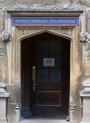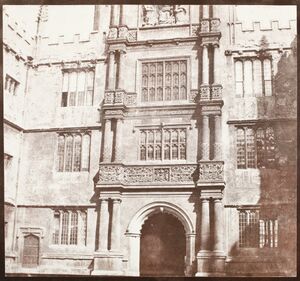 The three wings of the quadrangle have three floors: rooms on the ground and upper floors of the quadrangle (excluding Duke Humfrey's Library, above the Divinity School) were originally used as lecture space and an art gallery. The lecture rooms are still indicated by the inscriptions over the doors (see illustration). As the library's collections expanded, these rooms were gradually taken over, the university lectures and examinations were moved into the newly created University Schools building.[24] The art collection was transferred to the Ashmolean. One of the schools was used to host exhibitions of the library's treasures, now moved to the renovated Weston Library, whilst the others are used as offices and meeting rooms for the library administrators, a readers' common room, and a small gift shop.