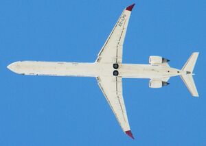 The CRJ900 is a stretched 76–90 seat version of the CRJ700. The first CRJ900 (C-FRJX) was modified from the prototype CRJ700 by adding longer fuselage plugs fore and aft of the wings. It was later converted into the prototype CRJ1000 by replacing the fuselage plugs with longer plugs.[68] The CRJ900 also features strakes located at the rear of the plane. The CRJ900 competes with the Embraer 175, and is more efficient per seat-mile, according to Bombardier.[69] Mesa Air Group was the launch customer for the CRJ900 painted in America West livery. The FAA Type Certificate designation of the CRJ900 is the CL-600-2D24.