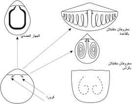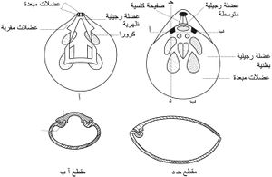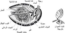 الرجيلة Pedicle | Contains coelom with muscles running through | لا رجيلات | No coelom, muscles where joins body | ||
