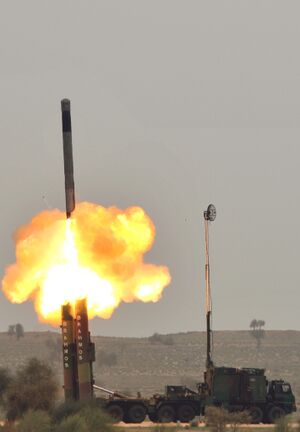![]() صاروخ براهموس أُطلق من منصة إطلاق متحركة أرضية. | |