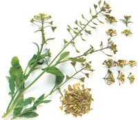 -القبسيلة Capsella المعروفة بشرابة الراعي C.bursa-pastoris المستعملة: قابضة، مخففة للنزف، مطهرة بولية، منشطة للدورة الدموية، خافضة لضغط الدم (الشكل ـ2)، وتصل وحداتها التصنيفية المستعملة في الزينة إلى قرابة 50جنساً أشهرها: