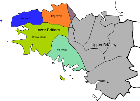 The four traditional dialects of Breton correspond to medieval bishoprics, rather than to linguistic divisions. They are leoneg (léonard, of the county of Léon), tregerieg (trégorrois, of Trégor), kerneveg (cornouaillais, of Cornouaille), and gwenedeg (vannetais, of Vannes).[23] Guérandais was spoken up to the beginning of the 20th century in the region of Guérande and Batz-sur-Mer. There are no clear boundaries between the dialects because they form a dialect continuum and vary only slightly from one village to the next.[24] Gwenedeg, however, requires a little study to be intelligible with most of the other dialects.[25] Due to this difficulty in intelligibility, the Glottolog project split the Gwenedeg dialects into a separate language entry from the KLT Breton dialects in v5.2 under the name Vannetais.[26]