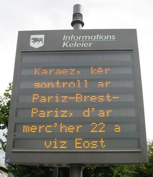 Ofis Publik ar Brezhoneg, the Breton-language agency, was set up in 1999 by the Brittany region to promote and develop the daily use of Breton.[31] It helped to create the Ya d'ar brezhoneg campaign, to encourage enterprises, organisations and communes to promote the use of Breton, for example by installing bilingual signage or translating their websites into Breton.[32]