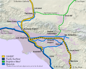 In the original plan, the route did not extend into Los Angeles due to the high cost of building rail in urban areas.[67] The 50-ميل (80 km) extension from Victor Valley to the city of Palmdale, where it would connect to the California High-Speed Rail system currently in development, in order to provide service to Los Angeles, was not included in the initial phase.[68] In June 2012, the new plan included the link between Victor Valley and Palmdale as part of construction for the first phase of the project. Passengers would transfer to Metrolink to access the Los Angeles area.[69]