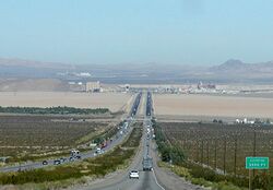 The highway carries heavy traffic on Thursday, Friday, and Sunday which causes significant delays.[18] Motorists returning to Los Angeles on Sunday can create a 18-ميل (29 km) backup.[19] Airlines have direct flights, but traffic and security at the airport add time to the short flight.[20][12] Las Vegas lost its last passenger train service in 1997 when Amtrak canceled the Desert Wind.[21]