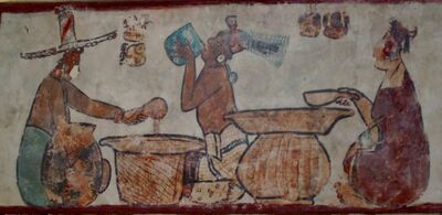 Calakmul is one of the most structure-rich sites within the Maya region. The site contains 117 stelae, the largest total in the region.[7] Most are in paired sets representing rulers and their wives.[7] However, because these carved stelae were produced in soft limestone, most of these stelae have been eroded beyond interpretation. Also many elaborate murals were discovered at Calakmul. These murals do not represent activities of the elite class. Rather, they depict elaborate market scenes of people preparing or consuming products such as atole, tamales, or tobacco as an ointment. Also items being sold were textiles and needles. These murals also have glyphs within them describing the actions occurring.[90] The most prominent figure in these murals is identified as Lady Nine Stone; she appears in many scenes. This brings a world of the Maya marketplace to vibrant life for archaeologists. Another highly beneficial resource to Maya archaeological understanding at Calakmul is the ceramic remains. The composition of the ceramic materials identifies the region or more specifically the polity that produced them. Ceramics with the snake emblem glyph found at several sites also give more evidence to identify ties or control over that site by Calakmul.