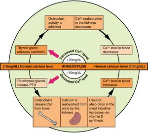تتم المحافظة على تركيز ثابت من الكلسيوم خارج الخلوي عبر الامتصاص المعوي، وارتشاف الشوارد من الطور المعدني للعظام. يتزايد امتصاص الكلسيوم خلال فترات النمو في الأطفال، وفي الحوامل والمرضعات، في حين يتناقص مع تقدم العمر. يمتد الوارد المثالي اليومي من الكلسيوم بين 400مغ في الأطفال و1500مغ لكبار السن (فوق 65 عاماً). وتشمل طرق سحبه من الدم: الإفراز عبر السبيل المعوي، والإفراغ البولي، والتوضع في الطور المعدني للعظام، والضياع في العرق.