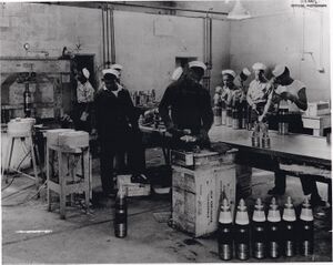 African American sailors of an ordnance battalion preparing 5-inch shells for packing at the Port Chicago Naval Magazine in 1943