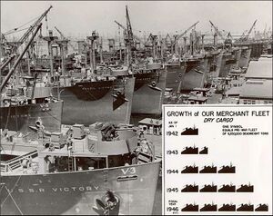 The United States Merchant Marine operated merchant ships out of California US Navy and private ports to supply goods needed around the world. Most merchant ships operated with civilian merchants and US Navy armed guards to man the deck guns under the Merchant Marine Act of 1936. Merchant Marine operated many different types of ships, the most numerous type was the Liberty ships and Victory ships. Merchant Marine training was conducted by the Coast Guard.[151][152][153][154] The Maritime Service established several Merchant Marine training centers in California for World War 2: