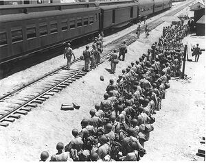 American railroads moved 70% of all freight transported in the United States in 1940. During World War II the passenger and freight volume increased vastly. Railroads moved about 90% of the military's cargo need and transported 98% of military personnel. Railroads worked overtime to keep up with demand. It was patriotic to avoid all unnecessary travel, to give space needed for troop movement. Railroad brought troops to California training centers and camps.[62] Railroad brought workers to California's growing defense industry. During World War II rail-line moved to Diesel locomotives and away from the labor-intensive steam locomotives. The Army had special hospital cars built to move wounded soldiers, one operated out of San Francisco.[63][64]