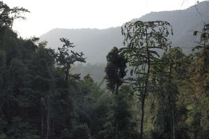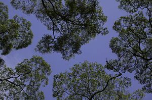 Forest canopies are home to unique flora and fauna not found in other layers of forests. The highest terrestrial biodiversity resides in the canopies of tropical rainforests.[8] Many rainforest animals have evolved to live solely in the canopy and never touch the ground. The canopy of a rainforest is typically about 10 متر (33 أقدام) thick, and intercepts around 95% of sunlight.[9] The canopy is below the emergent layer, a sparse layer of very tall trees, typically one or two per hectare. With an abundance of water and a near ideal temperature in rainforests, light and nutrients are two factors that limit tree growth from the understory to the canopy.