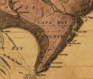 Detail of a 1777 map depicting Cape May County. The area shown was the scene of military activity, the Battle of Turtle Gut Inlet, early in the American Revolutionary War.