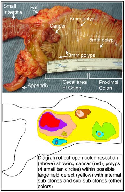 في القولون، من المحتمل أن ينشأ عيب في الحقل عن طريق الانتخاب الطبيعي لخلية متحولة أو متغيرة تخلقياً بين الخلايا الجذعية في قاعدة أحد الخبايا المعوية على السطح الداخلي للقولون. قد تحل الخلايا الجذعية الطافرة أو المعدلة وراثيًا محل الخلايا الجذعية القريبة الأخرى عن طريق الانتخاب الطبيعي. قد يتسبب هذا في ظهور لطخة من الأنسجة الغير طبيعية. يتضمن الشكل الموجود في هذا القسم صورة لجزء حديث تم استئصاله ومفتوح طوليًا من القولون يُظهر سرطان القولون وأربعة سلائل حميدة. يوجد أسفل الصورة رسم تخطيطي لكيفية تشكل لطخة كبيرة من الخلايا الطفرية أو المعدلة وراثيًا، كما هو موضح في المساحة الكبيرة باللون الأصفر في الرسم التخطيطي. ضمن هذه اللطخة الكبيرة الأولى في الرسم التخطيطي (نسيلة كبيرة للخلايا)، قد تحدث طفرة ثانية أو تغيير تخلقي، بحيث تكتسب خلية جذعية معينة ميزة مقارنة بالمجاورين لها، وقد تتوسع هذه الخلية الجذعية المتغيرة بشكل نسيليي، وتشكل لطخة ثانوية، أو نسيلة فرعي، داخل اللطخة الأصلية. يشار إلى هذا في الرسم التخطيطي بأربع لطخات أصغر بألوان مختلفة داخل المنطقة الأصلية الكبيرة الصفراء. ضمن هذه اللطخات الجديدة (النسخ الفرعية)، يمكن تكرار العملية عدة مرات، يشار إليها باللطخات الأصغر داخل اللطخات الثانوية الأربعة (مع ألوان مختلفة في الرسم التخطيطي) والتي تتوسع بشكل نسيليي، حتى تظهر الخلايا الجذعية التي تولد إما سلائل صغيرة أو ورم خبيث (السرطان). في الصورة، نتج عن عيب مجال واضح في هذا الجزء من القولون أربعة سلائل (مُصنَّفة بحجم السلائل، 6 مم، 5 مم، واثنان 3 مم، وسرطان حوالي 3 سم في البعد الأطول له). يشار إلى هذه الأورام أيضًا (في الرسم البياني أسفل الصورة) بواسطة 4 دوائر سمراء صغيرة (السلائل) ومنطقة حمراء أكبر (السرطان). حدث السرطان الذي في الصورة في منطقة الأعور من القولون، حيث يلتقي القولون بالأمعاء الدقيقة (المسماه في الصورة) وحيث تحدث الزائدة الدودية (المسماه في الصورة). الدهون في الصورة خارجية للجدار الخارجي للقولون. في جزء القولون الموضح هنا، تم فتح القولون بالطول لكشف سطحه الداخلي ولإظهار السرطان والسلائل التي تحدث داخل البطانة الظهارية الداخلية للقولون.