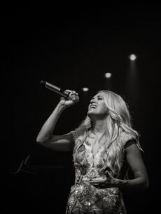 Underwood's second album, Carnival Ride,[67] was released in October 2007.[68] On Carnival Ride, Underwood was more involved in the songwriting process; she set up a writers' retreat at Nashville's Ryman Auditorium to collaborate with such Music Row tunesmiths as Hillary Lindsey, Craig Wiseman, Rivers Rutherford, and Gordie Sampson.[69] Carnival Ride moved over 527,000 copies in its first week, debuting at number one on both the Billboard 200 and Top Country Albums, as well as number one on the Canadian Albums Chart, one of the biggest first-week sales by a female artist.[70] Carnival Ride was certified double platinum in just two months after its release in December.[71] The album is now certified four times Multi-Platinum by the RIAA.[40] "So Small", the first single from the album, was released in July 2007 and reached number one on Billboard's Hot Country Songs, topping it for three consecutive weeks.[72] "All-American Girl", the second single, also reached number one on the Hot Country Songs chart. The next single, "Last Name", reached number one on the Hot Country Song chart as well. This made Underwood the first female artist to have two consecutive albums each release three number ones on this chart since Shania Twain in 1998. "Just a Dream", the album's next single, was released in July 2008 and later peaked at number one on the Hot Country Songs chart, staying there for two consecutive weeks. With that, Underwood became the first solo female artist to pull four number one's from one album since Twain did it with The Woman in Me.[73] The album's fifth single, "I Told You So", a duet with the original singer of the song, Randy Travis, was released in February 2009. It peaked at number two on the Country charts and number nine on the Billboard Hot 100. All singles from Carnival Ride were certified Platinum by the RIAA, for selling more than one million copies each.[40] In January 2008, Underwood embarked on a joint tour with Keith Urban called the Love, Pain and the Whole Crazy Carnival Ride Tour, with dates fixed nationwide that continued through April.[74] She then started her headlined tour, the Carnival Ride Tour, in February 2008, with dates across all North America, and ended it on December 14, 2008, playing to 1.2 million fans throughout the tour and being named the top-selling country female touring artist of 2008.[75]