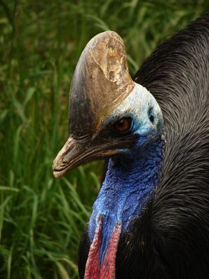 Around 90% of the Cassowary diet consists of fruit, although all species are opportunistic omnivores, and take a range of other plant foods, including shoots and grass seeds, in addition to fungi, invertebrates, eggs, carrion, fish, and small vertebrates like rodents, small birds, frogs, lizards, and snakes.[6] Although all ratites can eat meat, Cassowaries, by definition, are the most omnivorous and, therefore, the largest omnivorous bird where meat still forms a minute part of their diet.[7] Indeed, whilst not hypercarnivorous predators like birds-of-prey, cassowaries including juveniles are not picky eaters and are willing to eat anything that will fit in their mouths.[8][9][10] They also have the most varied diet in protein consumption, in contrast to other ratites such as ostriches, where meat is largely used as a substitute in harsh times and is limited to mere invertebrates and small animals. Cassowaries are very wary of humans, but if provoked, they are capable of inflicting serious, even fatal, injuries upon both dogs and people. The cassowary has often been labelled "the world's most dangerous bird",[5][11] although in terms of recorded statistics, it pales in comparison to the common ostrich that is recorded to kill two to three humans per year in South Africa.[12]