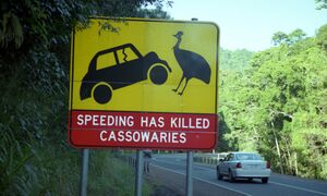 Hand feeding cassowaries poses a significant threat to their survival because it lures them into suburban areas. There, the birds are more susceptible to encounters with vehicles and dogs.[46] Contact with humans encourages cassowaries to take food from picnic tables. Feral pigs also are a significant threat to their survival. They destroy nests and eggs of cassowaries, but their worst effect is as competitors for food, which may be catastrophic for the cassowaries during lean times.[47][48]