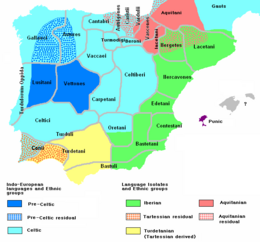 كلت أيبيريا Celtiberians كانوا مجموعة من الكلت والشعوب المتعلقة بهم سكنت منطقة في وسط-شمال شرق شبه جزيرة أيبيريا أثناء القرون الأخيرة قبل الميلاد. They were explicitly mentioned as being Celts by several classic authors (e.g. Strabo[1]). These tribes spoke the Celtiberian language and wrote it by adapting the Iberian alphabet, in the form of the Celtiberian script.[2] The numerous inscriptions that have been discovered, some of them extensive, have enabled scholars to classify the Celtiberian language as a Celtic language, one of the Hispano-Celtic (also known as Iberian Celtic) languages that were spoken in pre-Roman and early Roman Iberia. Archaeologically, many elements link Celtiberians with Celts in Central Europe, but also show large differences with both the Hallstatt culture and La Tène culture.