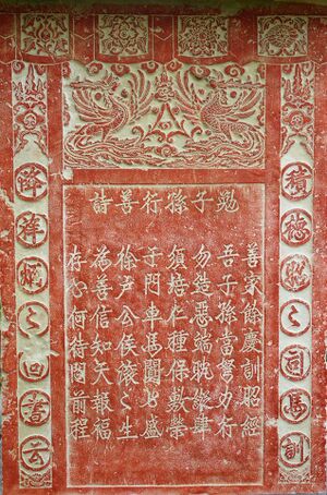 Children around the age of 6–8 begin learning chữ Hán at schools.[11] Students began by learning characters from books such as Nhất thiên tự (一千字; 'one thousand characters'), Tam thiên tự (三千字; 'three thousand characters'), Ngũ thiên tự (五千字; 'five thousand characters'), and the Three Character Classic (三字經).[11] The primers were often glossed with chữ Nôm.[12] As such with Nhất thiên tự (一千字), it was designed to allow students to make the transition from Vietnamese grammar to Classical Chinese grammar.[13] If students read the Chinese characters only, the words will be in an alternating rhyme of three and four, but if it was read with the chữ Nôm glosses, it would be in the Vietnamese lục bát rhyme. These books gave students a foundation to start learning more difficult texts that involved longer sentences and more difficult grammatical structures in Literary Chinese. Students would study texts such as Sơ học vấn tân (𥘉學問津; 'inquiring in elementary studies'), Ấu học ngũ ngôn thi (幼學五言詩; 'elementary learning of the five-character verses'), Minh tâm bảo giám (明心寶鑑; 'precious lessons of enlightenment'), and Minh Đạo gia huấn (明道家訓; 'precepts of Minh Đạo').[14] These books taught the basic sentences necessary to read Literary Chinese and taught core Confucian values and concepts such as filial piety. In Sơ học vấn tân (𥘉學問津), it has four character phrases that were divided into three sections, one on Chinese history, then Vietnamese history, and lastly on words of advice on education.[13]