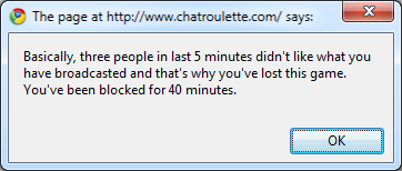 In response, the website has discouraged under-18s from using the site, and prohibits "pornographic" behavior. Users who experience harassment or witness illegal, immoral, or pornographic activity may report the offending user. If three users complain about the same participant within five minutes, the user is temporarily banned from the service.[5] In August 2012, Chatroulette removed the Safe Mode feature of the website,[مطلوب توضيح] and posted new terms and conditions, stating that nudity was no longer allowed on any part of the site.[24] Chatroulette later changed their terms of use, making it a requirement that all users sign up before using the service.