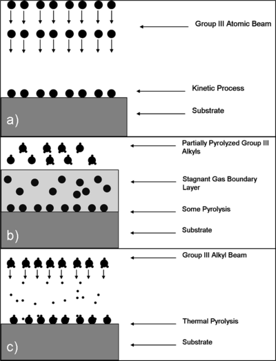 In CBE processes, the hydrides are cracked in a high temperature injector before they reach the substrate. The temperatures are typically 100-150 °C lower than they are in a similar MOCVD or MOVPE.[5] There is also no boundary layer (such as the one in MOCVD) and molecular collisions are minimal due to the low pressure. The group V alkyls are usually supplied in excess, and the group III alkyl molecules impinge directly onto the heated substrate as in conventional MBE. The group III alkyl molecule has two options when this happens. The first option is to dissociate its three alkyl radicals by acquiring thermal energy from the surface, and leaving behind the elemental group III atoms on the surface. The second option is to re-evaporate partially or completely undissociated. Thus, the growth rate is determined by the arrival rate of the group III alkyls at a higher substrate temperature, and by the surface pyrolysis rate at lower temperatures.[2]