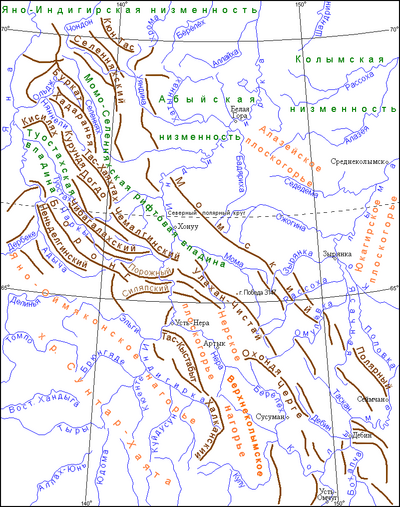 - Tirekhtyakh Range and Nelgesin Range, between the Adycha and Sartang rivers