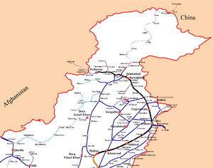 المرحلة الأولى من تطوير وإعادة بناء كراتشي-پشاو، خط السكة الحديدية الرئيسي تظهر باللون الأسود بين پشاور و ملتان. تطوير وإعادة بناء الخط ستسمح للقطارات بالسفر بسرعة تصل إلى 160 كيلومتر في الساعة. كما يظهر أيضاً بالخط الأزرق المتقطع سكة حديد خونجراب المقترحة إلى الحدود الصينية.