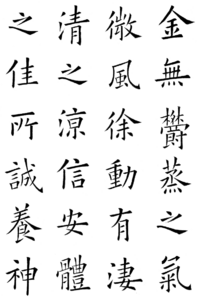 • The characters must be written correctly.[4] A correctly written character is composed in a way that is accepted as correct by legitimate calligraphers. Calligraphic works often use variant Chinese characters, which are deemed correct or incorrect case-by-case, but in general, more popular variants are more likely to be correct. Correct characters are written in the traditional stroke order and not a modern standard.